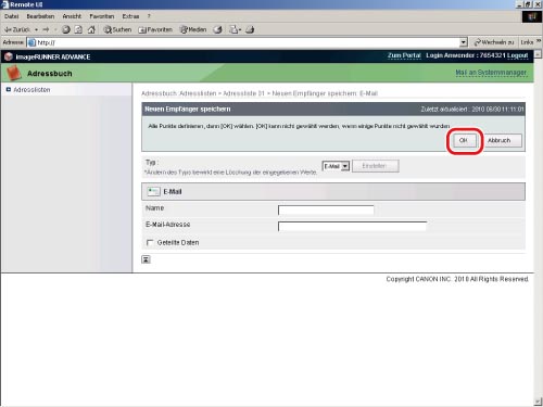 Sie können eine E-Mail-Adresse effektiv über Remote UI registrieren.