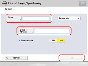 Geben Sie [Name] und [E-Mail-Adresse] ein → Berühren Sie die Taste [OK].