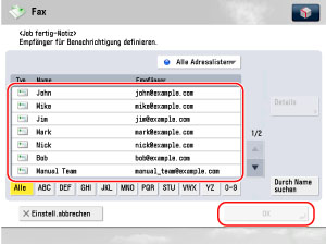 Berühren Sie im Hauptmenü nacheinander die Tasten [Fax] → [Optionen] → [Job fertig-Notiz] → Wählen Sie den Empfänger der Job fertig-Notiz → Berühren Sie die Taste [OK] → [Schließen].