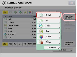 Wählen Sie bei Typ die Option [E-Mail] → Klicken Sie auf [Einstellen] → Geben Sie bei [Neuen Empfänger speichern: E-Mail] einen Namen und eine E-Mail-Adresse ein.