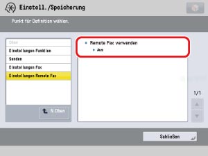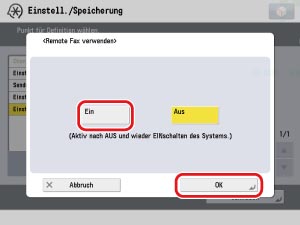 Wählen Sie [Ein] für <Remote Fax verwenden> → Berühren Sie die Taste [OK].