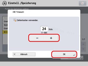 Definieren Sie die Dauer für SE Timeout mit den Tasten [-] und [+] → Bestätigen Sie durch Berühren der Taste [OK].