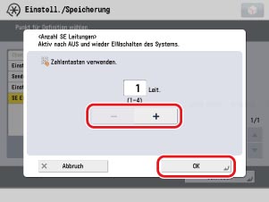 Legen Sie die Anzahl der zu verwendenden Telefonleitungen durch Berühren der Tasten [-] und [+] fest → Bestätigen Sie durch Berühren der Taste [OK].