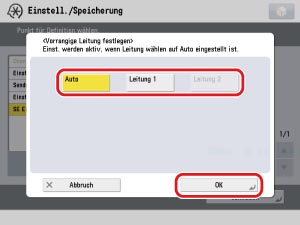 Wählen Sie [Auto] oder die vorrangig zu verwendende Leitung → Berühren Sie [OK] → [Schließen].