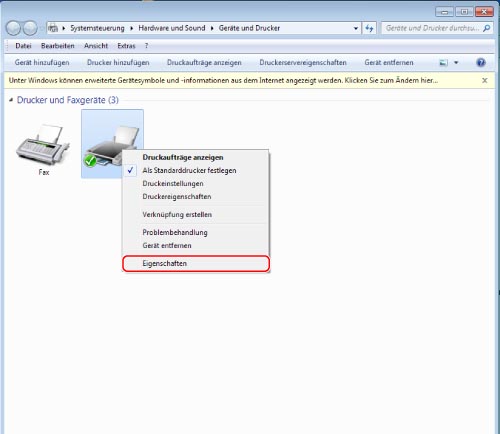 Klicken Sie im Ordner [Drucker] (oder im Ordner [Geräte und Drucker]) mit der rechten Maustaste auf das Druckersymbol für den Drucker, für den Sie die Einstellungen festlegen möchten → Klicken Sie auf [Eigenschaften] (oder [Druckereigenschaften]).