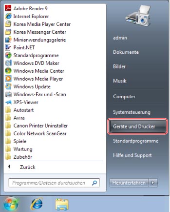 Wählen Sie für Windows XP [Start] → [Drucker und Faxgeräte] (oder [Start] → [Systemsteuerung] → [Drucker und andere Hardware] → [Drucker und Faxgeräte]). Klicken Sie für Windows Vista auf [