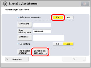 Betätigen Sie die Taste [Einstellungen SMB-Auth.] → Aktivieren Sie [SMB-Authentisierung verw.].