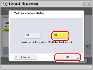 → [Einstellungen Funktion] → [Dateien speichern/Zugänglich machen] → [Einstellungen Erweiterter Platz] → [Von Extern schreiben verbieten].