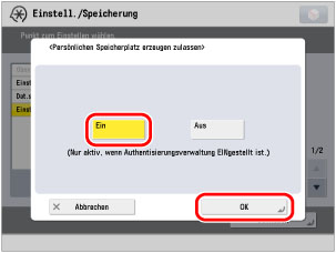 Wählen Sie [Persönlichen Speicherplatz erzeugen] → Berühren Sie die Taste [OK].