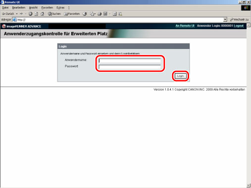 Starten Sie das Remote UI → Geben Sie die folgende URL in Ihren Web Browser ein → Klicken Sie auf [Login Administrator].