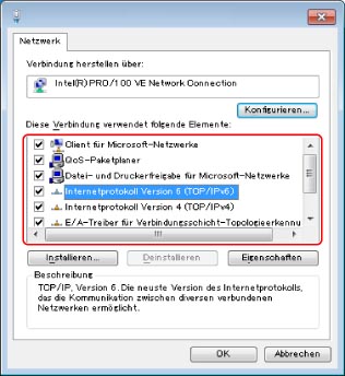 Unter Windows Vista klicken Sie auf [Systemsteuerung] → [Netzwerk und Internet] → [Netzwerk- und Freigabecenter] → Klicken Sie bei der LAN-Verbindung auf [Status anzeigen] → [Eigenschaften]. Aktivieren Sie im Dialogfeld [Status von LAN-Verbindung] die Einträge [Client für Microsoft-Netzwerke], [Datei- und Druckerfreigabe für Microsoft-Netzwerke], [Internetprotokoll Version 6 (TCP/IPv6)] sowie [Internetprotokoll Version 4 (TCP/IPv4)].