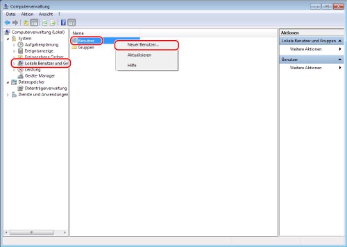 ] (Start) → Klicken Sie mit der rechten Maustaste auf [Computer] → Klicken Sie auf [Verwalten] → [Computerverwaltung (Lokal)] → [Systemprogramme] → [Lokale Benutzer und Gruppen] → Klicken Sie mit der rechten Maustaste auf [Benutzer] → Wählen Sie [Neuer Benutzer].