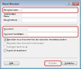 Geben Sie im Dialogfeld [Neuer Benutzer] die Daten zu [Benutzername], [Kennwort] und [Kennwort bestätigen] ein → Klicken Sie auf [Erstellen].