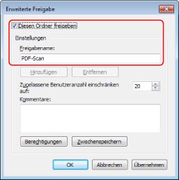 Unter Windows XP klicken Sie mit der rechten Maustaste auf den Freigabeordner → Wählen Sie [Eigenschaften] → Klicken Sie auf die Registerkarte [Freigabe] → Klicken Sie auf [Diesen ordner freigeben] → Geben Sie [Freigabename] ein. Unter Windows Vista/Windows 7 klicken Sie mit der rechten Maustaste auf den Freigabeordner → Wählen Sie [Eigenschaften] → [Freigabe] → [Erweiterte Freigabe] → [Diesen ordner freigeben] → Geben Sie [Freigabename] ein.