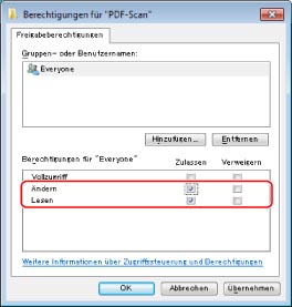 Klicken Sie auf [Berechtigungen] → Stellen Sie sicher, dass der Anwendername oder Gruppenname für die Zugriffsberechtigung auf den Freigabeordner ausgewählt wurde → Prüfen Sie, ob für [Ändern] die Option [Zulassen] sowie [Lesen] ausgewählt wurden.