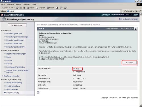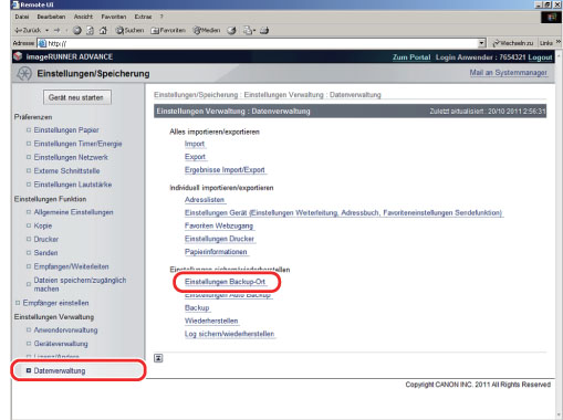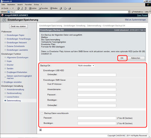 Klicken Sie für die Verwaltungseinstellungen auf [Datenverwaltung] → [Einstellungen Backup-Ort].
