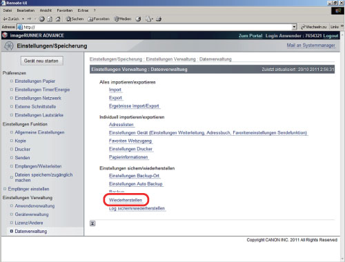 Um die auf dem Server gesicherten Daten wieder herzustellen, klicken Sie auf die Option [Wiederherstellen].
