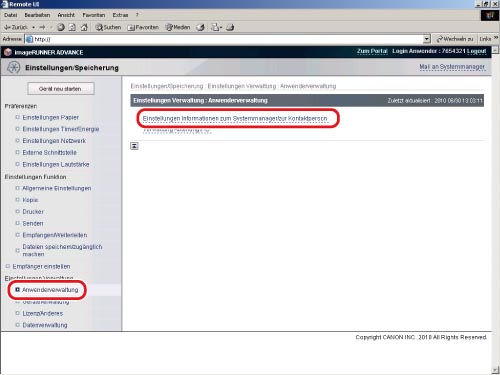 Greifen Sie auf Remote UI zu → Klicken Sie auf [Einstellungen/Speicherung] → [Anwenderverwaltung] → [Einstellungen Informationen zum Systemmanager/zur Kontaktperson].