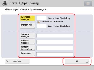 Wählen Sie [ID und PIN einstellen] → Geben Sie maximal 7 Zeichen bei [Systemmanager ID] ein → Wählen Sie [PIN ändern] → Geben Sie maximal 7 Zeichen bei [System PIN] und [Bestätigen] ein. Die Systemmanager-ID und System-PIN werden beim Einloggen in Einstellungen/Speicherung benötigt.