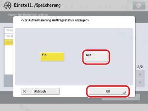 Berühren Sie die Taste [Auftragsstatus vor Authentisierung anzeigen] → [Aus] → [OK].