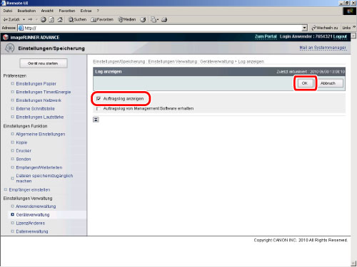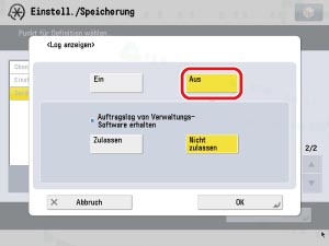 Wählen Sie [Zulassen] oder [Nicht zulassen] für <Auftragslog mit Verwaltungs-Software erhalten> → Berühren Sie die Taste [OK].