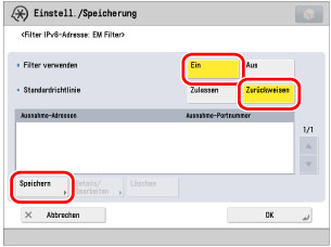 Berühren Sie die Taste [Ein] für <Filter verwenden> → Berühren Sie die Taste [Zurückweisen] für <Standardrichtlinie> → Berühren Sie die Taste [Speichern].