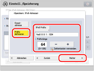 Berühren Sie die Taste [Präfix definieren] → Geben Sie 'fec0:0:0:1::1234' unter [IPv6 Präfix] ein → Geben Sie '64' unter [Präfixlänge] ein → Bestätigen Sie durch Berühren der Taste [Weiter].