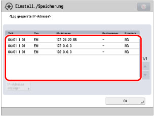 [Einstellungen/Speicherung] → [Einstellungen Netzwerk] für <Präferenzen> → [Log gesperrte IP-Adresse].