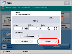 Der Kopiervorgang für den neuen Auftrag startet automatisch, sobald der aktuelle Auftrag beendet wurde. Wenn die Meldung <Drucken nicht möglich, da die Auftragsreservierung voll ist oder der Drucker aufwärmt. Einen Moment warten und neu versuchen.> angezeigt wird, berühren Sie [OK] → Versuchen Sie, den Auftrag nach Abschluss des laufenden Auftrags noch einmal zu reservieren.