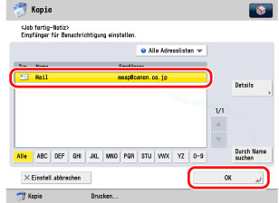 Wählen Sie den Empfänger für die Job fertig-Notiz → Berühren Sie [OK].