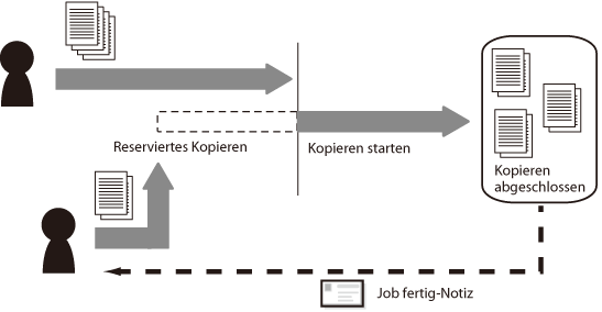 Wenn das System einen Auftrag verarbeitet, können Sie erst nach Abschluss des aktuellen Auftrags den nächsten Auftrag starten. Wird beispielsweise ein großer Kopierauftrag verarbeitet, müssen Sie warten, bis der Kopierauftrag vollständig abgeschlossen wurde. In diesem Fall können Sie die Funktion zum Reservieren eines Kopierauftrags verwenden, um während der Verarbeitung des aktuellen Auftrags Originale einzuscannen, um den Kopiervorgang dann nach Abschluss des laufenden Auftrags zu starten. Wenn Sie sich durch eine Job-fertig-Notiz über den Abschluss Ihres Kopierauftrags benachrichtigen lassen, unterstützt dies die effiziente Abwicklung von Kopieraufträgen.