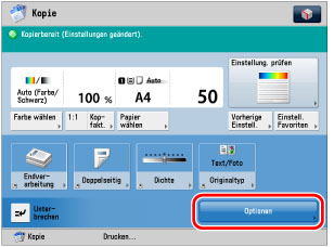 Berühren Sie [Optionen] auf dem Grundfunktionendisplay zum Kopieren.