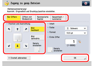 Wählen Sie die Art der Nummerierung, die Ausrichtung und die Position der Seitennummern → Berühren Sie die Taste [OK].