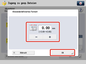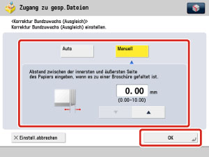 Wenn die Druckposition der Bilder verschoben ist und Sie den Bundzuwachs ausgleichen möchten, berühren Sie die Taste [Korrektur Bundzuwachs] → Wählen Sie [Auto] oder [Manuell] → Betätigen Sie durch Berühren der Taste [OK].