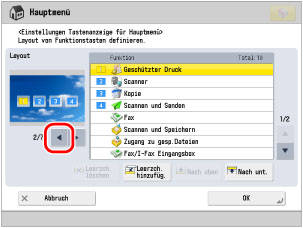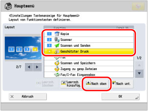 Wiederholen Sie Schritt 4 und bewegen Sie damit [Scannen und Speichern] auf Position <2>, [Fax] auf Position <3> und [Geschützter Druck] auf Position <4>.