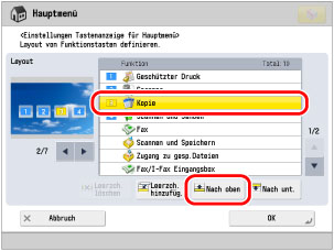 Wählen Sie [Kopie] → Berühren Sie die Taste [Nach oben], um sie an Position <1> zu verschieben.