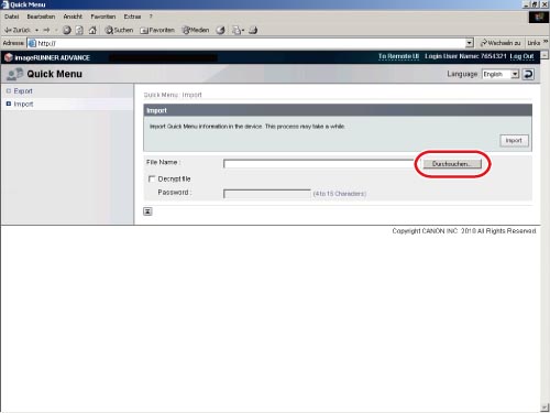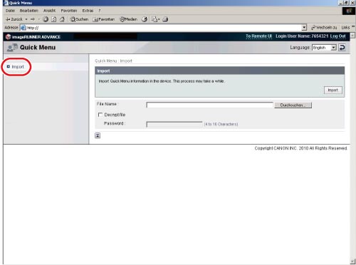 Rufen Sie die Seite zum Importieren durch Anklicken von [Import] auf.
