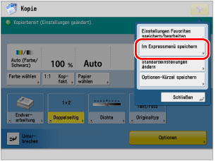Wenn Sie häufig verwendete Funktionseinstellungen wie z. B. Kopieren, Scannen und Senden sowie Scannen und Speichern im Expressmenü speichern, können Sie diese Einstellungen auch auf einem anderen System verwenden.