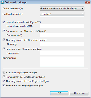 Sie können das Deckblatt im Dialogfeld [Einstellungen für Faxversand] konfigurieren. Weitere Informationen finden Sie unter "Weitere Informationen".