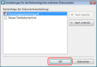 (Faxausgabe)-Symbol das Dialogfeld [Einstellungen für die Reihenfolge bei mehreren Dokumenten] angezeigt. Legen Sie im Dialogfeld [Einstellungen für die Reihenfolge bei mehreren Dokumenten] die Reihenfolge für die Zusammensetzung der Dokumente in der Dokumentenmappe fest.