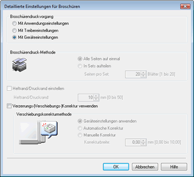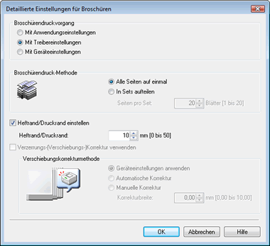 Sie können im Dialogfeld [Detaillierte Einstellungen für Broschüren] unter [Broschürendruckvorgang] durch Auswahl von [Mit Treibereinstellungen] detaillierte Einstellungen mit dem Treiber für den Broschürendruck, einschließlich der Aufteilung der gedruckten Seiten in Sätze, sowie die Bundstegbreite konfigurieren.