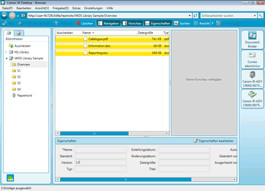 Wählen Sie eine Bibliothek und einen Ordner in der Bibliothek, um die als Dokumentenmappe zusammenzusetzenden Dokumente in Bereich Objektpalette. anzuzeigen.