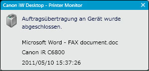 Außerdem wird bei Fertigstellung eines Druckauftrags eine Benachrichtigung über die Fertigstellung des Auftrags angezeigt.