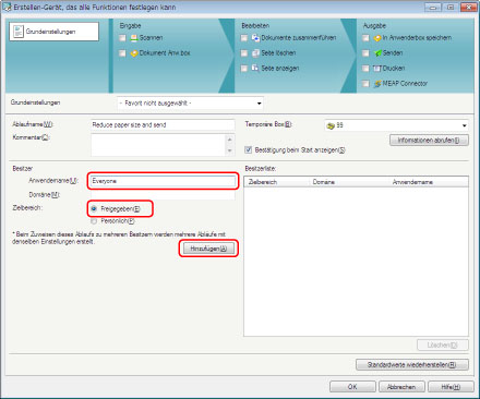Geben Sie für [Anwendername] unter [Besitzer] die Angabe 'Everyone' ein → Wählen Sie [Gemeinsam] für [Zielbereich] → Klicken Sie auf [Hinzufügen].