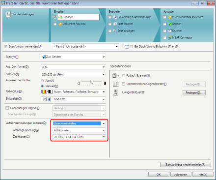 Wählen Sie [Zoom voreinstellen] für [Einstellungen zum Kopierfaktor] → Wählen Sie [Inchformat] für [Größengruppierung] → Wählen Sie [70% (A3 -> A4, B4 -> B5)] für [Kopierfaktor].