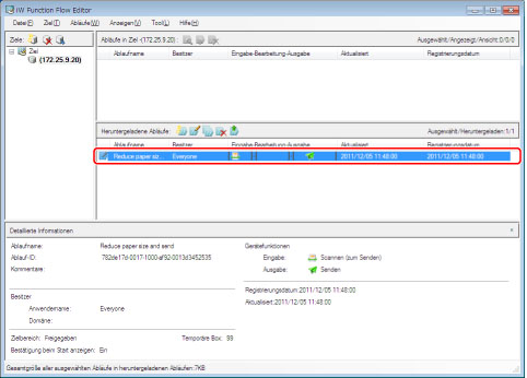 Wählen Sie Ihren Ablauf ([Reduce paper size and send]) unter der Liste [Heruntergeladene Abläufe].