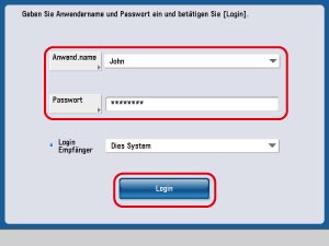 Geben Sie im Anmeldedisplay eines Systems, auf dem iW Function Flow installiert ist, [Anwend.name] und [Passwort] ein → Berühren Sie die Taste [Login].