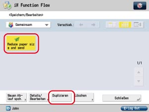 Wählen Sie den zu duplizierenden Ablauf ([Reduce paper size and send]) → Berühren Sie die Taste [Duplizieren].