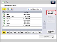 Das erste Zeichen, das Sie für den Namen eingeben, wird zum Sortieren der Empfängerliste verwendet, wenn Sie Tasten, wie z. B. [ABC], [DEF] und [GHI], auf dem Adressbuchdisplay berühren. Durch Berühren der Taste [Durch Name suchen] auf dem Adressbuchdisplay wird ein Display zur Einschränkung der Suche im Adressbuch angezeigt.