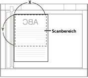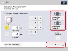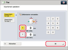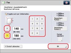 Berühren Sie die Tasten [X] und [Y] → Geben Sie das Scanformat mit den Zahlentasten ein → Berühren Sie die Taste [OK].